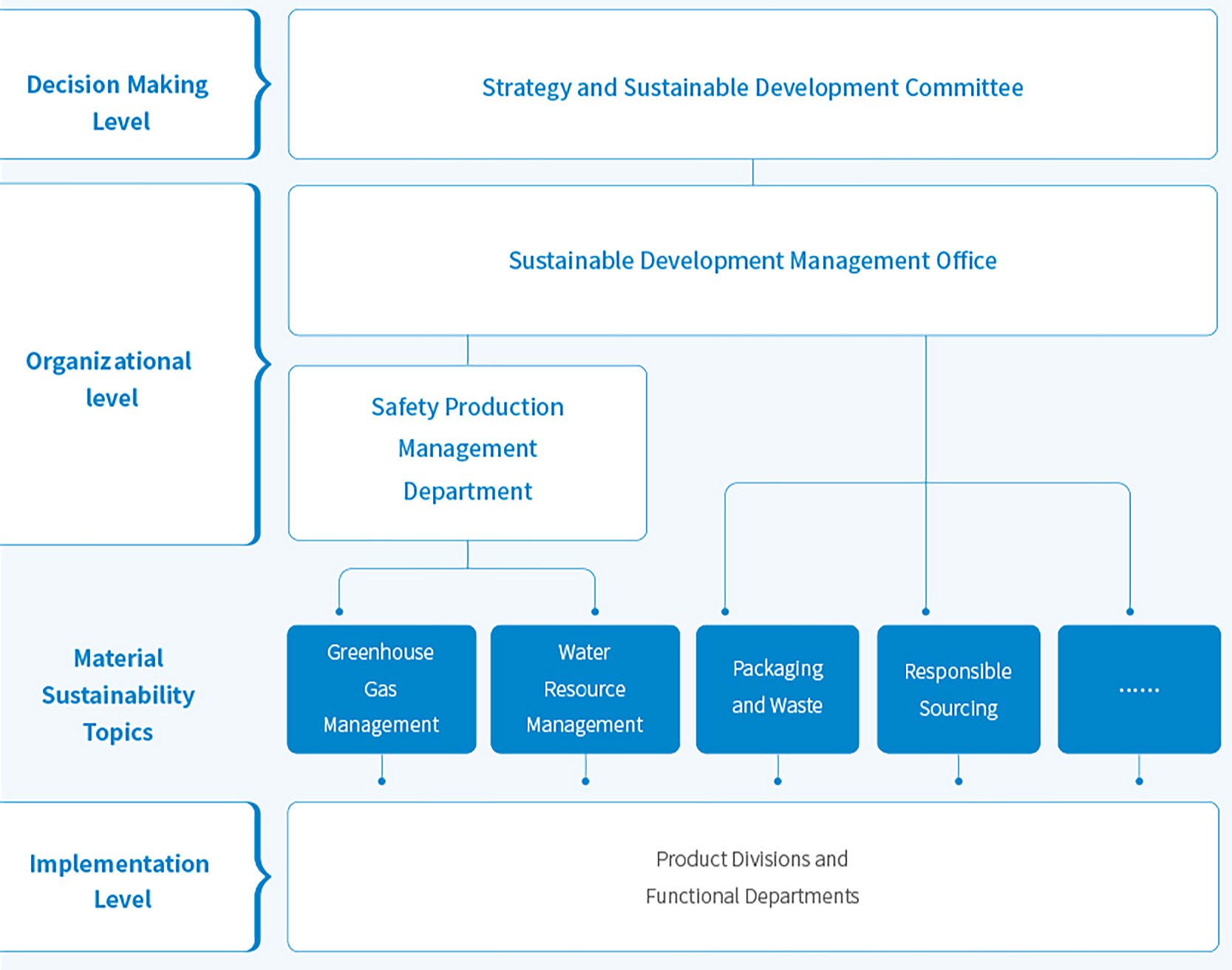 Yili has established a Strategy and Sustainable Development Committee at the board level, which is composed of eight directors (including two independent directors), under the charge of Mr. Pan Gang, the Chairman and President of Yili. Apart from business development strategy, the Committee also focuses on researching and recommending sustainability strategic plans for Yili's long-term development. The Committee also oversees its sustainability strategy implementation across the company (including greenhouse gas management). The Sustainable Development Office is under Strategy and Sustainable Development Committee, which is responsible for the sustainability performance supervision and report to the Strategy and Sustainable Development Committee on a regular basis. The Safety Production Management Department of Yili is responsible for day-to-day management of GHG emissions. The department has a dedicated Carbon Management Director responsible for offering technical support for executing the GHG reduction project across Yili's different business units. The quarterly progress reports are submitted to the Sustainable Development Management Office for review and monitoring purposes.