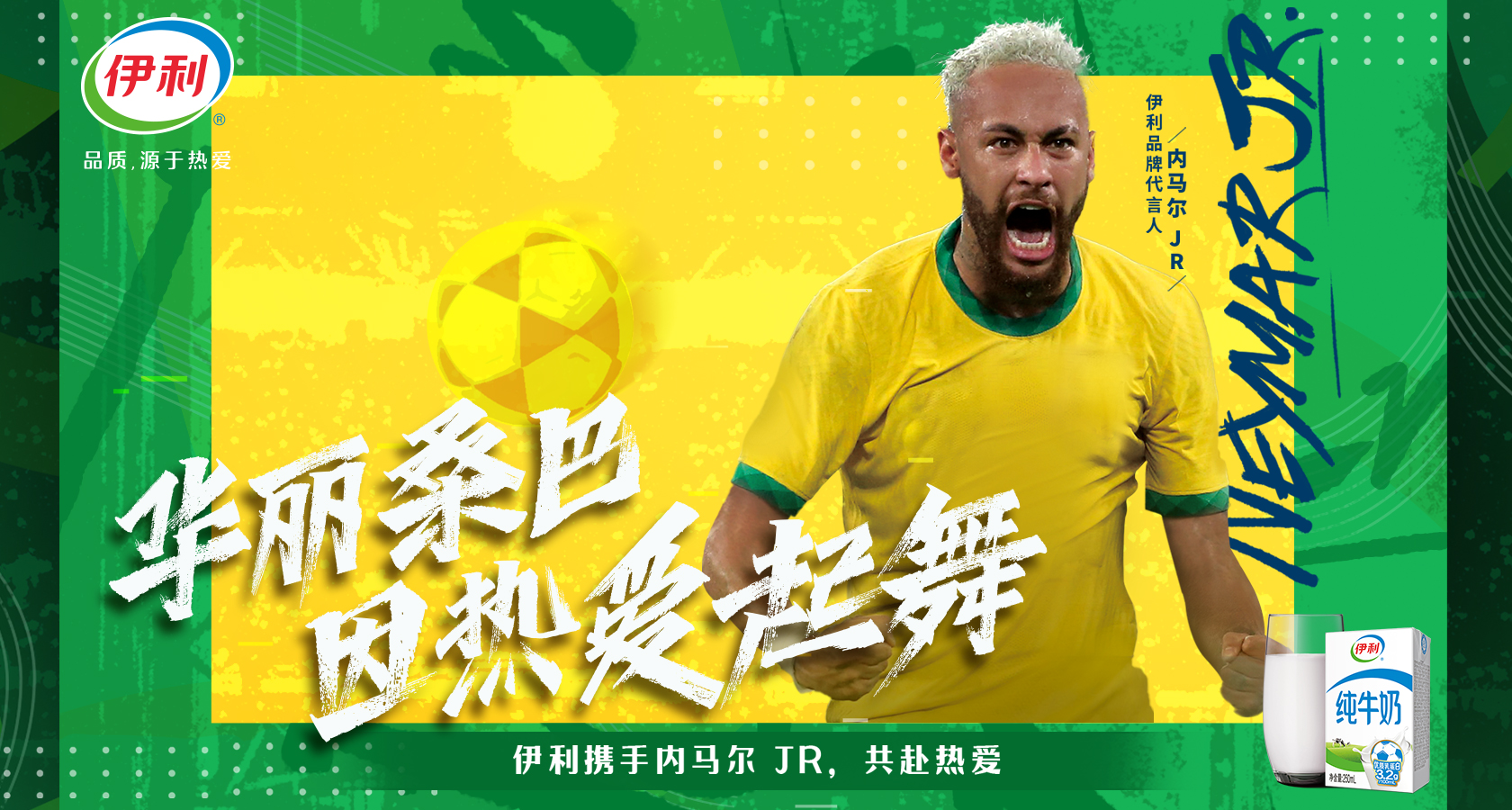 2022年10月13日,伊利正式宣布签约巴西国家男子足球队队长内马尔为品牌代言人。此前,伊利已相继签约克里斯蒂亚诺·罗纳尔多(C罗)、大卫·贝克汉姆、武磊等足坛巨星,以及阿根廷、葡萄牙、西班牙、德国等多支世界足坛劲旅,此次伊利揽“马儿”入怀,使布局已久的伊利“梦之队”更加闪耀。